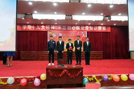 本次競賽分為必答題、搶答題、風險題三個環(huán)節(jié),題庫準備了1000道考題,內(nèi)容涵蓋了十九大、新黨章黨規(guī)黨紀、習近平系列重要講話等相關知識點。各代表隊參賽選手使出渾身解數(shù),冷靜作答,密切配合,氣氛活躍而緊張,上演了一場精彩紛呈的黨建文化盛宴。競賽現(xiàn)場精彩紛呈,高潮迭起,選手們既有毫不猶豫的快速回答,也有充分商討后的沉著應答,展現(xiàn)了他們豐富的知識積累和敏捷的思辨能力。在工作人員統(tǒng)計分數(shù)的間隙,主持人與現(xiàn)場學生進行了互動,把難度較大的風險題拋給大家搶答,有7位同學獲得了現(xiàn)場搶答獎勵——《習近平系列重要講話讀本》。