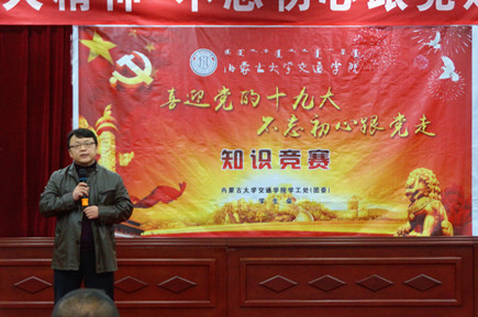 11月15日晚7時,由學工處(團委)和黨群工作部共同舉辦的內(nèi)蒙古大學交通學院“喜迎黨的十九大,不忘初心跟黨走”主題知識競賽在交通樓A453拉開帷幕。黨群工作部郭鵬飛、學工處(團委)孫立宇出席活動。近300名學生現(xiàn)場觀摩了競賽。
