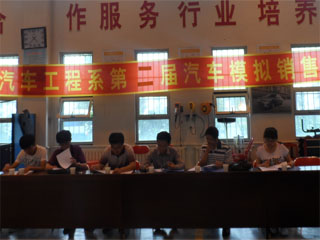為了豐富學(xué)院大學(xué)生的課余生活,展示當(dāng)代大學(xué)生的精神面貌及自身素質(zhì),培養(yǎng)大學(xué)生把理論運(yùn)用于實踐的能力,我院汽車工程系在豐田實驗室舉辦“第二屆汽車模擬銷售大賽”。 汽車工程系副主任李政、黨總支書記鐘懷軍、主任助理李春芾、學(xué)工辦主任姚延剛、學(xué)生會主席孫榮欣擔(dān)任大賽評委。