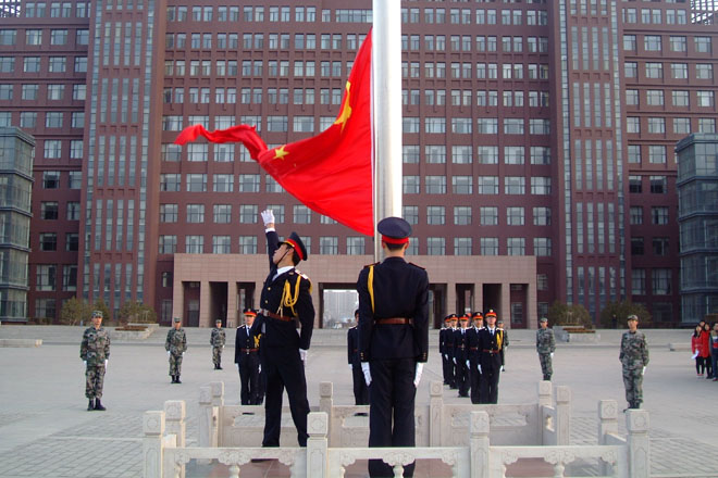 清晨,東方欲曉,學(xué)院國旗護(hù)衛(wèi)隊的28名同學(xué)在南校區(qū)主教學(xué)樓前集合整隊,邁著矯健的步伐整齊地走向升旗臺。隨著軍樂團(tuán)的國歌奏響,五星紅旗迎著朝陽冉冉升起,全體同學(xué)面向國旗行注目禮,祝愿偉大的祖國繁榮昌盛,早日實現(xiàn)“中國夢”,再鑄新輝煌。