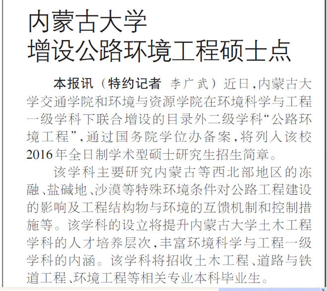 中國交通報:內(nèi)蒙古大學(xué)增設(shè)公路環(huán)境工程碩士點