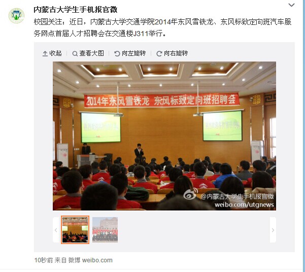 內(nèi)蒙古大學(xué)生手機(jī)報官微:交通學(xué)院成功舉辦2014年“東風(fēng)雪鐵龍”、“東風(fēng)標(biāo)致”首屆定向班汽車服務(wù)網(wǎng)點