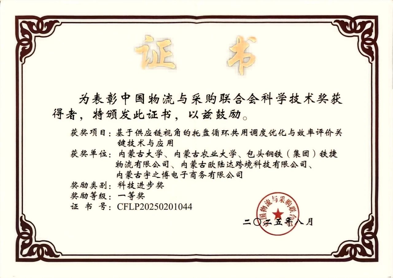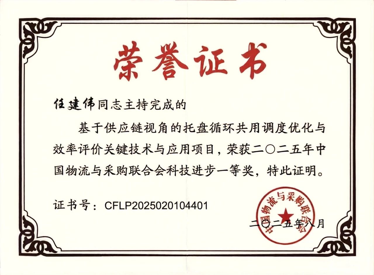 近日,中國(guó)物流與采購(gòu)聯(lián)合會(huì)(CFLP)正式公布了2025年度科學(xué)技術(shù)獎(jiǎng)評(píng)審結(jié)果。我院任建偉教授團(tuán)隊(duì)的研究成果“基于供應(yīng)鏈視角的托盤循環(huán)共用調(diào)度優(yōu)化與效率評(píng)價(jià)關(guān)鍵技術(shù)與應(yīng)用”榮獲科技進(jìn)步獎(jiǎng)一等獎(jiǎng)。成果主要完成人:任建偉、李成兵、陳春花、孫哲、徐鐵、李一川、閆振英、霍月英、張鵬、魏中華、喬曉波。